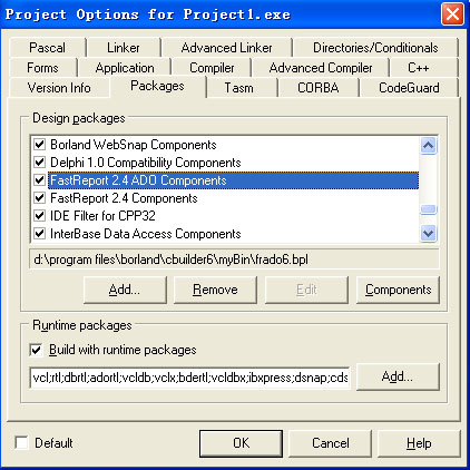 打开BCB的菜单"Project"->Option。然后在Packages的标签栏项目下,找到FastReport的所有部件,如下图的FastReport2.4 ADO Components 和 FastReport 2.4 Components。分别点击它们然后点地击“Remove”按钮逐个删除。卸载完成后返回,工具栏上面的FastReport和FR Tools两个选项栏也同时被清除。