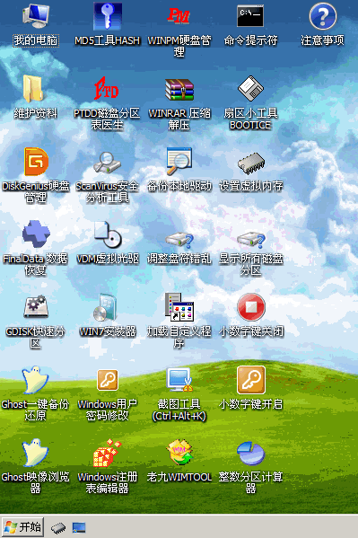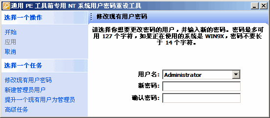 在该WinPE系统下面,我们可以使用有关软件修改被遗忘的原系统的登录密码,可以进行磁盘分区与格式化操作,可以安装原始的WinXP或Win7操作系统,或者Ghost安装系统。