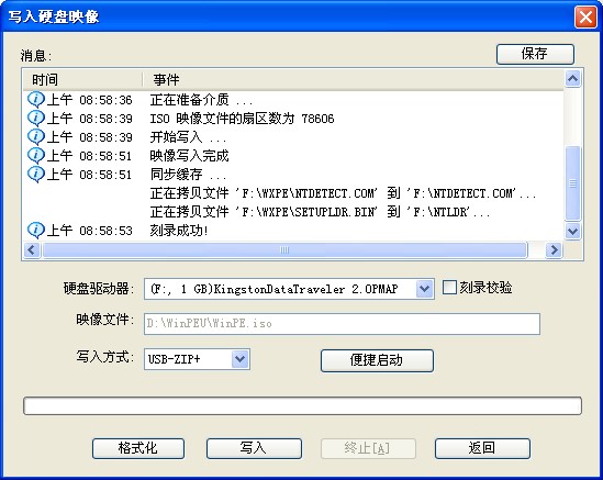 8、最后,点击“写入”,等待数秒,提示“刻录成功”后,点“返回”退出。
