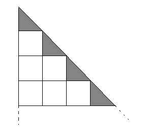 “我倒听说过一种几何方法”,我说,”如图1,每个小正方形边长为1,一共有n行小正方形,第一行有1个,第二行有2个,第三行有3个……第n行有n个.所有小正方形的面积之和就是(1+2+3+…+n),而所有小正方形的面积之和又等于一个直角边为(n+1)的等腰直角三角形的面积减去阴影部分的面积.阴影部分由(n+1)个直角边为1的等腰直角三角形组成.所以1+2+3+…n=1/2*(n+1)^2-1/2*(n+1)=1/2*n*(n+1).